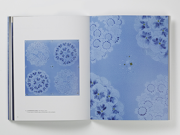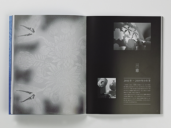 また、表紙は作品のクローズアップ写真の上から、銀の箔押しでタイトルを入れています。表紙をめくった表2と表3には、文様のアップを銀とスミの2色で印刷し、銀の深さと光沢を表しました。