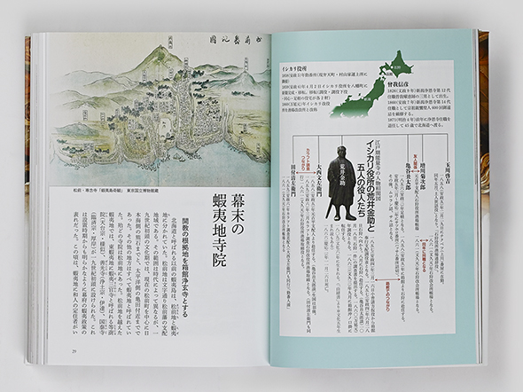 完成した寺史は、能量寺創建に大きく寄与した5人の門徒衆の人物相関図や埋もれていた歴史的写真など多数掲載することで、わかりやすさと資料性の高さを両立しています。また、資料として江戸時代の北海道区分を記した北海道地図を折込みで掲載し、大きく開いて見られるよう工夫しています。