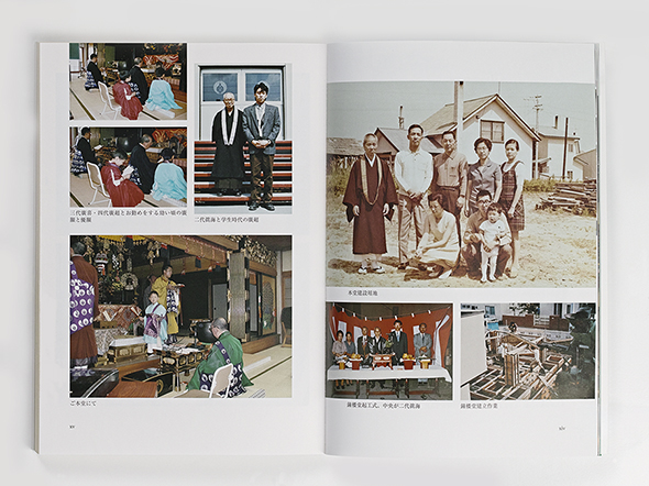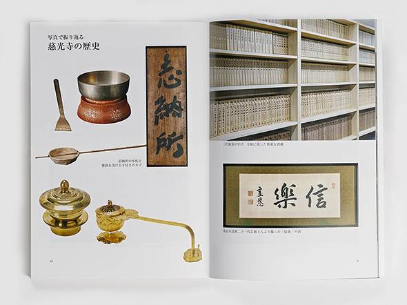 制作するにあたり、当社では ①原稿の素読み ②ご本堂撮影 ③資料収集 ④誌面レイアウト ⑤校正業務をお手伝いしました。特に、寺院の歴史を長きにわたり見守り続けてきた貴重な掛け軸や什器などの寺宝は新たにプロフォトグラファーが撮影を行い、一点一点の造形を際立たせる切り抜きの手法でレイアウトしています。